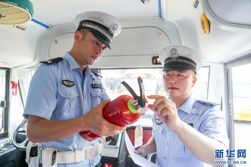 8月28日,四川省华蓥市公安局交通警察大队的民警在对校车配置的灭火器进行检查。
