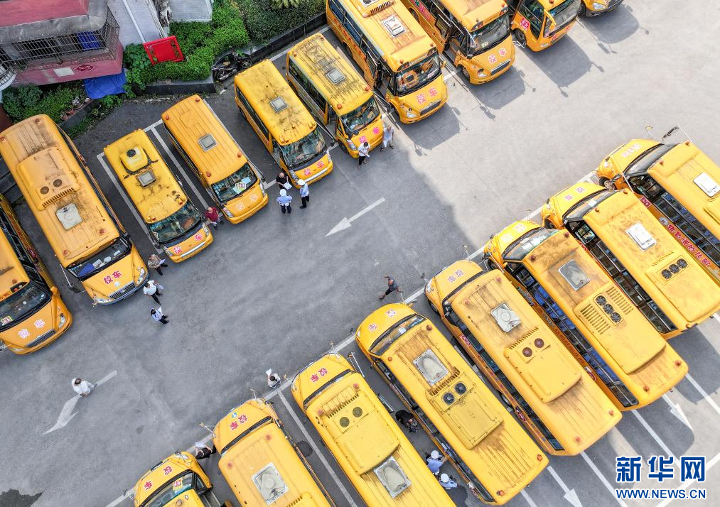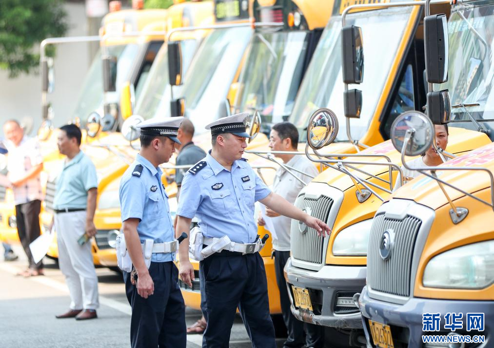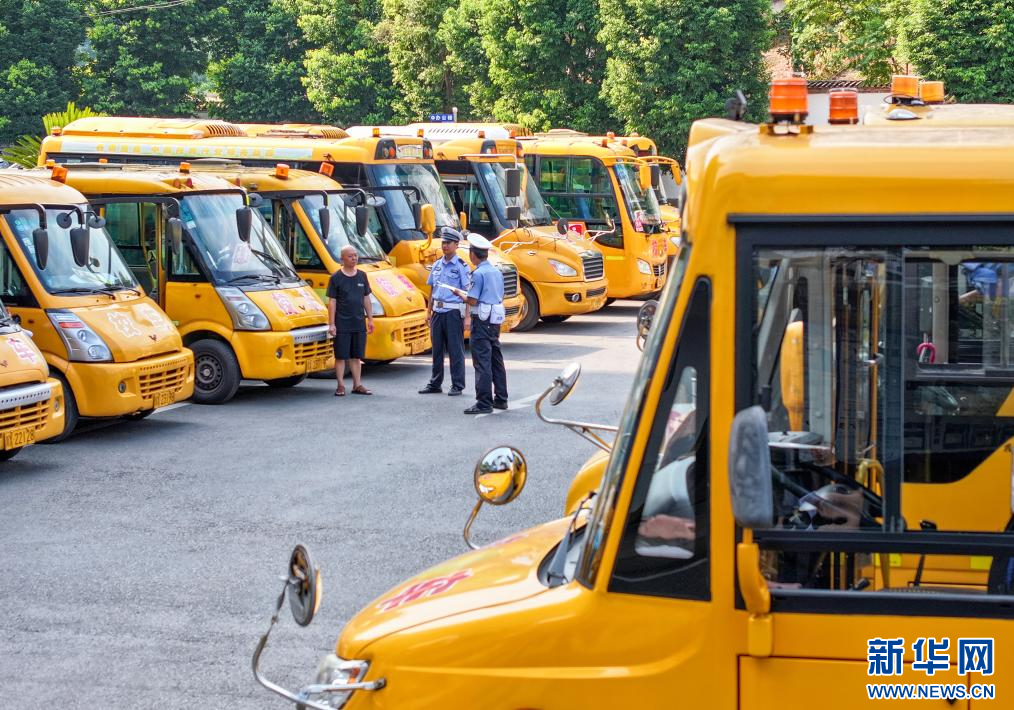 秋季新学期开学在即,四川省华蓥市公安局交通警察大队组织民警对辖区内近50辆校车的安全性能和随车配备的安全应急器材设备等进行检查,以及时排除隐患,确保学生乘车平安。(本组图片由邱海鹰、陈敏拍摄)