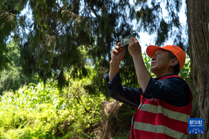 8月12日,在剑阁县汉阳镇,专职古柏守护员赵明用手机拍摄古柏。新华社记者 唐文豪摄
