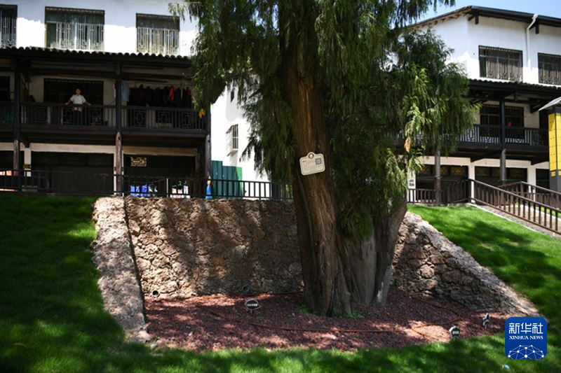 在剑门关古柏保护示范小区,居民屋前的古柏被精心维护,还有了专属“身份证”(8月12日 摄)。新华社记者 胥冰洁 摄