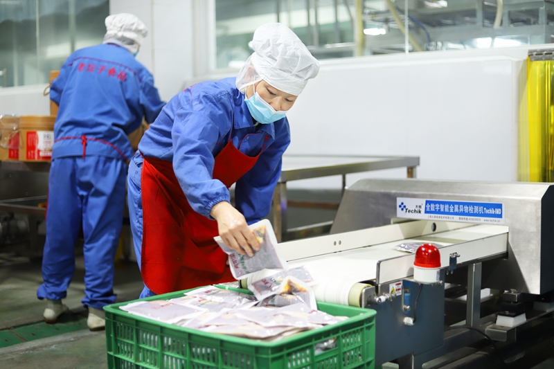 四川老坛子食品有限公司车间工人通过全数字智能金属异物检测机检测产品。(国家税务总局四川省税务局供图)