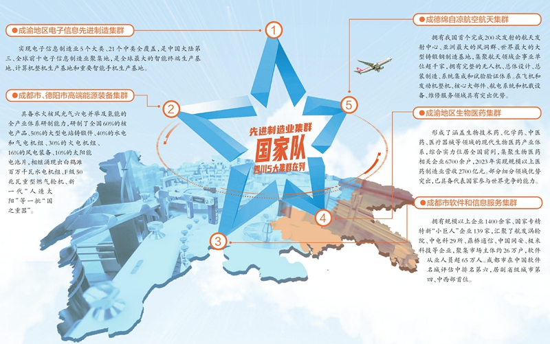从行业分布看,四川拥有的5个国家先进制造业集群,涉及新一代信息技术、高端装备、生物医药领域,全部集中在四川六大优势产业。