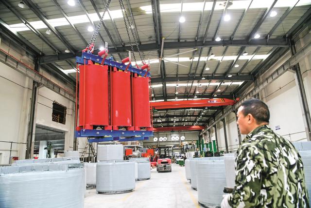 四川蓝瑞盟电气有限公司生产车间,工人吊运变压器产品。(张国盛 摄)