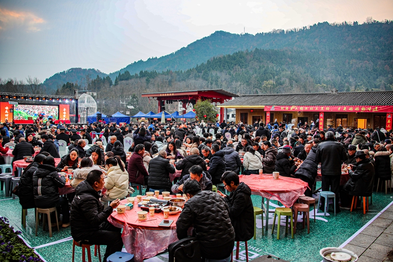 “开笼了!上菜了!开席了!”伴随着铿锵有力的喊声,80余桌团圆饭在四川省达州市宣汉县花仙谷景区整齐摆开,现场近1000名群众欢欢喜喜地吃着团圆饭,气氛热烈,喜庆祥和。