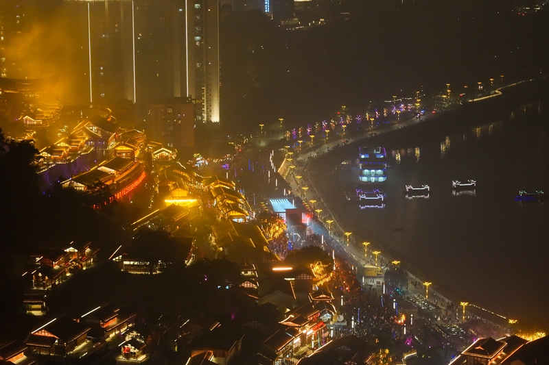 无人机秀落幕,游街正式开始。游客们穿越时空的长廊,感受古镇韵味,开启一段寻古探今的旅程。古装爱好者手提大红灯笼,成群结队点亮街头巷尾。高脚狮子、牛皮鼓、武胜剪纸等展示轮替上演,永寿寺豆腐干、麻辣牛肉、古镇“三味”等美食让人大饱口福。“万家灯火” “游园奇梦”“古镇嗨歌”“国潮演艺”“欢喜灯谜”等国风体验活动让喜庆的节日氛围愈显浓厚。(王林、夏俊林)