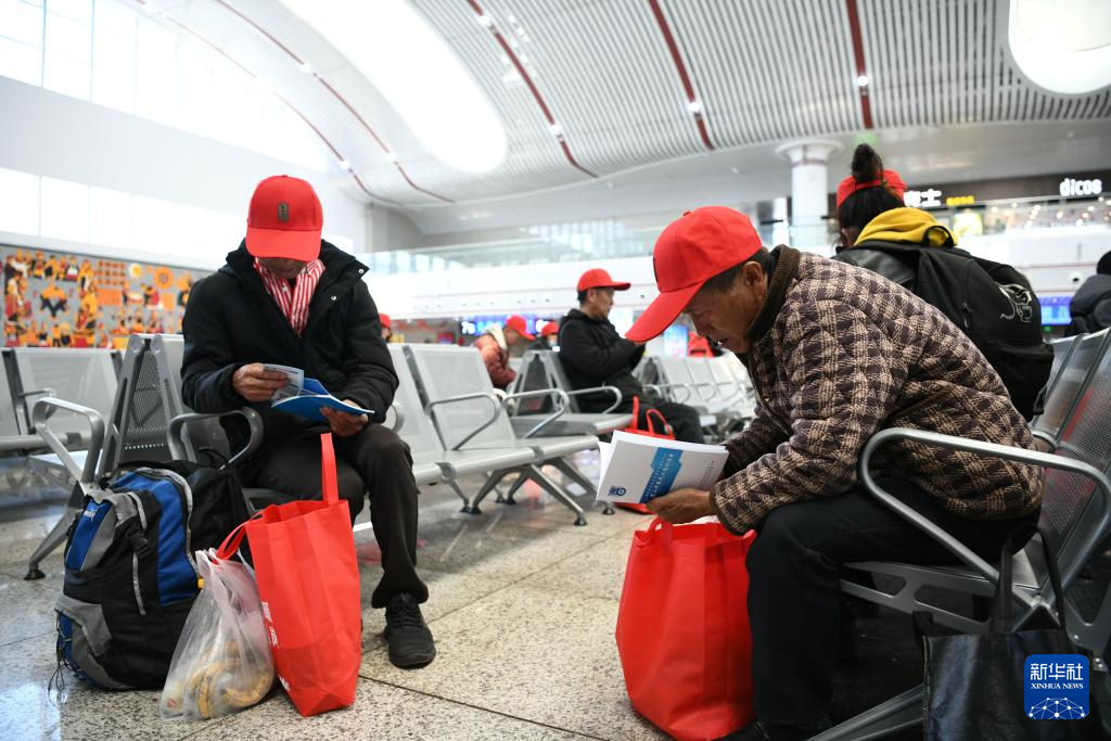 2月11日,在西昌西站,外出务工人员查看爱心礼包中的务工手册。新华社记者 胥冰洁 摄
