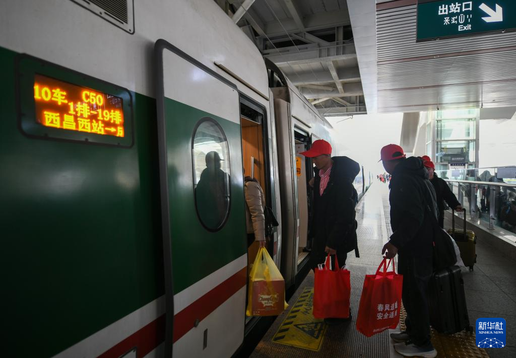 2月11日,在西昌西站,外出务工人员搭乘C50次列车前往成都务工。新华社记者 胥冰洁 摄