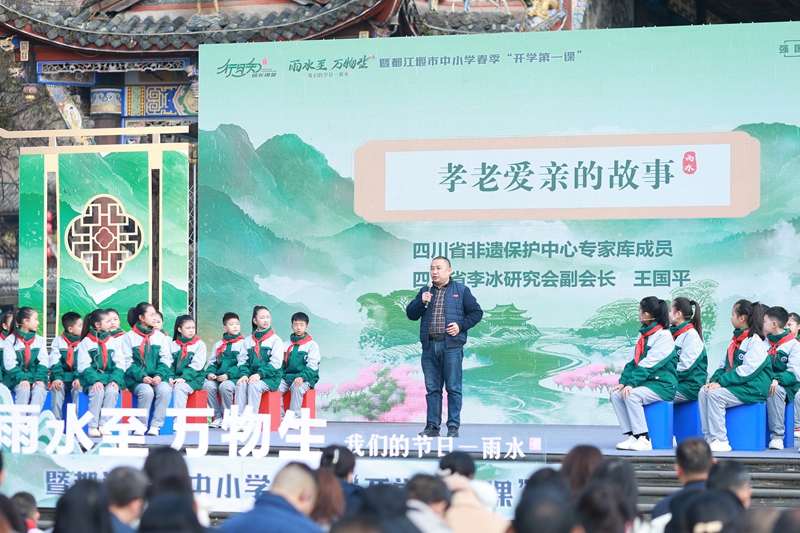 当日上午,在《二十四节气歌》的悦耳音乐声中,都江堰市“我们的节日·雨水”暨中小学春季“开学第一课”活动拉开帷幕。课程分为文趣、乐趣、玩趣、食趣4个篇章,通过老师传授节气知识、学生汇报观察心得、专家解读传统民俗等方式,向现场观众介绍雨水节气的来历、节气文化与自然变化等,并通过展示“罐罐肉”“长寿带”等传统民俗文化载体,引导孩子们感悟中华优秀传统文化的魅力。