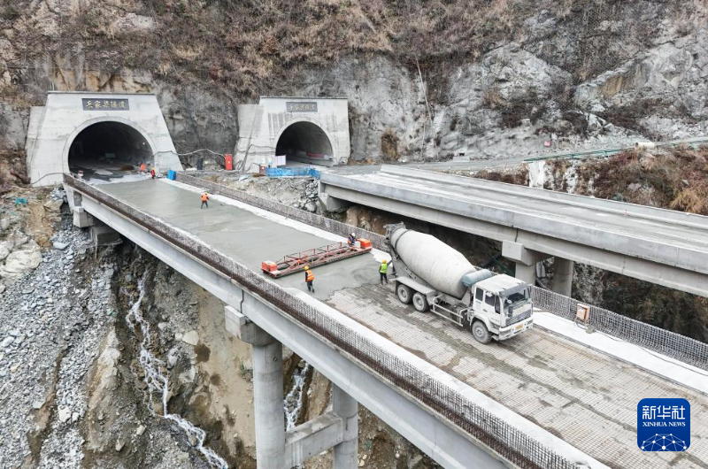 2月23日,中铁十一局的工人在米仓大道岳家梁隧道口施工(无人机照片)。新华社记者 王曦 摄