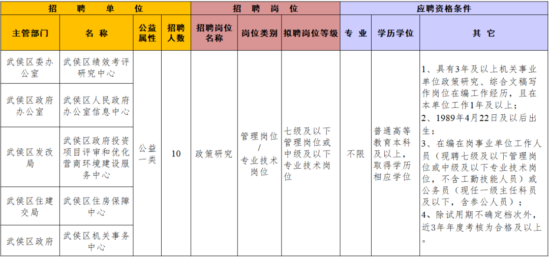 拟聘人员由武侯区组织人事部门根据人岗相适、人事相宜原则统筹安排岗位,须服从调配。入职人员在成都市武侯区最低服务期限为5年。