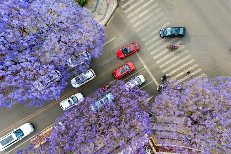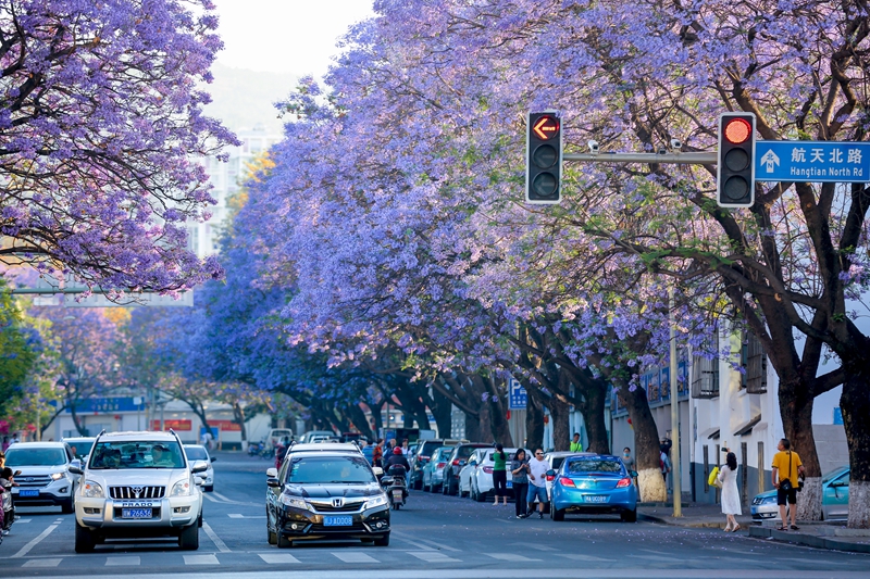 在四川省凉山彝族自治州西昌市,很多街道都种有蓝花楹,每年春夏之交,蓝花楹次第绽放,形成一片浪漫的花海景观,吸引来大批游客打卡体验。