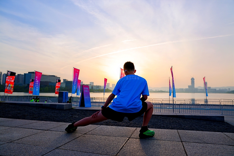 开赛前参赛者迎着朝阳热身。(兴隆湖环湖跑组委会 供图)
