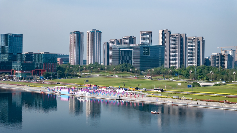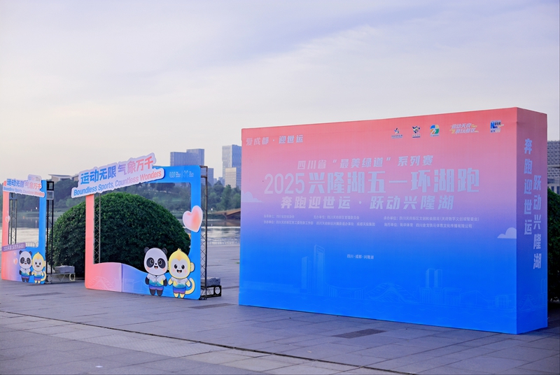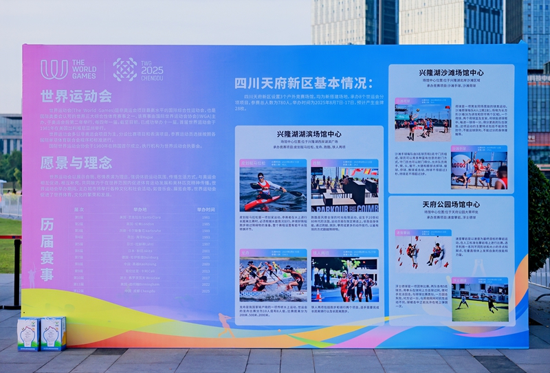 赛事现场设置的成都世运会展示板。(兴隆湖环湖跑组委会 供图)