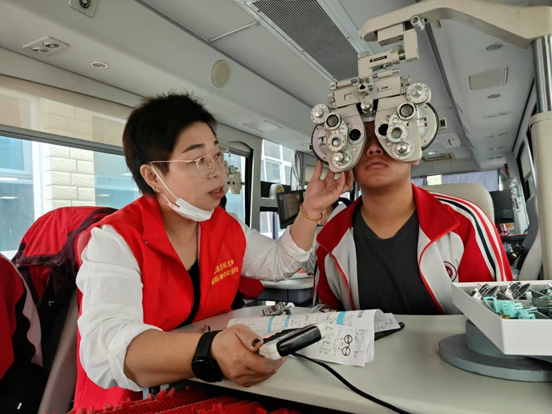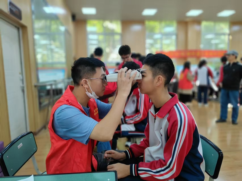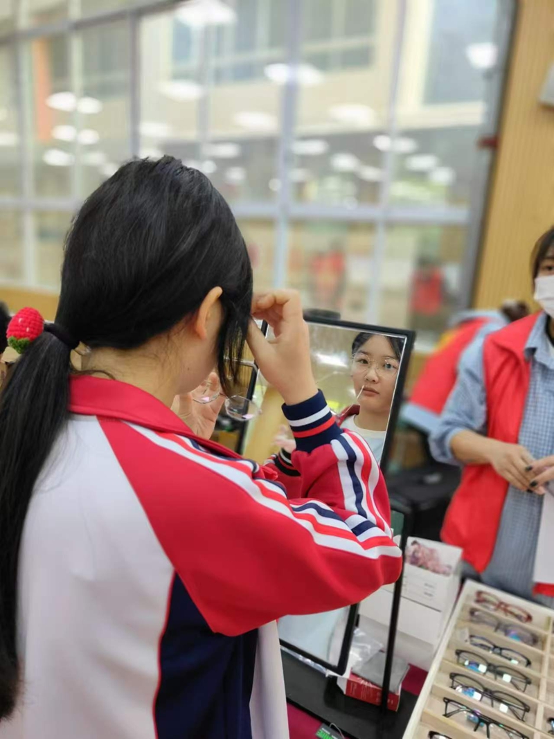 “验光是叔叔阿姨到学校来的,而且配眼镜全免费。”高二(二)班的学生伍金士多说,“谢谢叔叔阿姨,我一定好好学习,长大报效祖国。”公益人员在为学生配制近视眼镜的同时,还免费为学生开展“爱眼护眼”专项视功能检查,并向孩子们普及护眼爱眼知识。