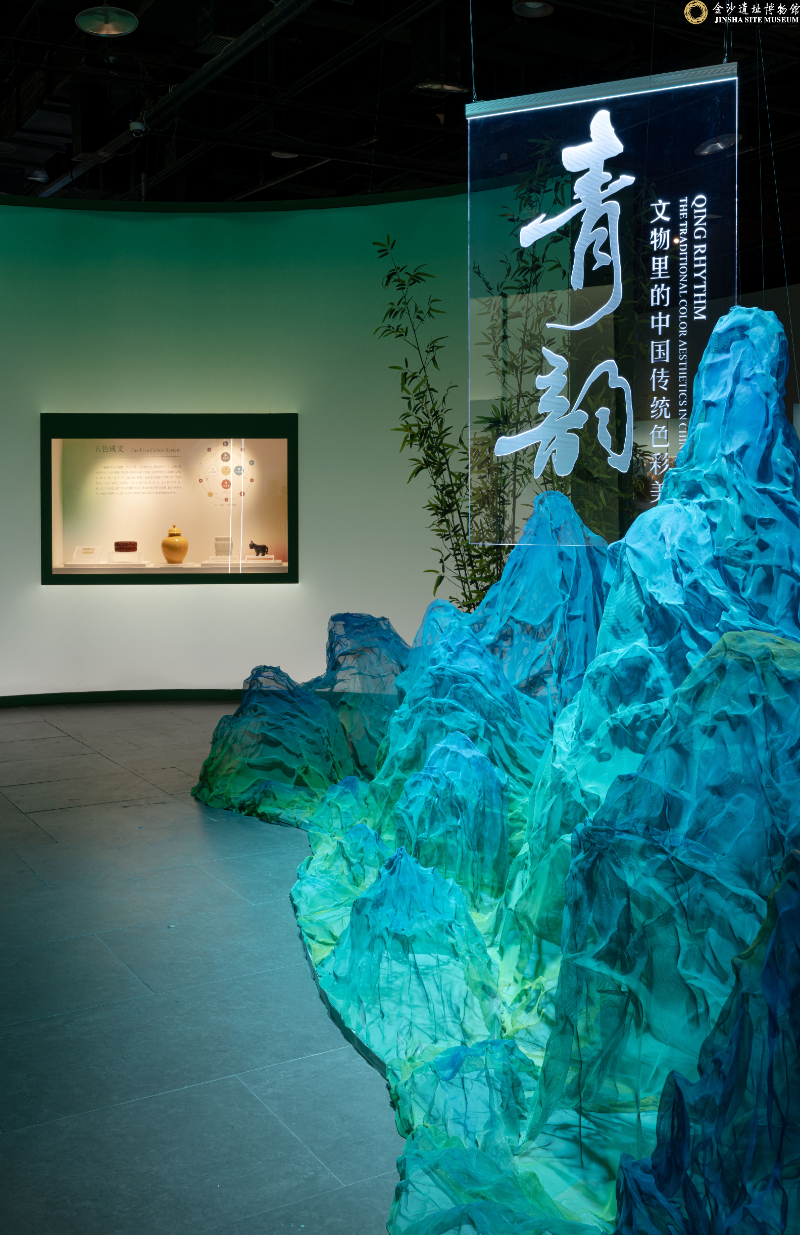 特展“青・韵——文物里的中国传统色彩美学”海报及展览现场。(成都金沙遗址博物馆 供图)