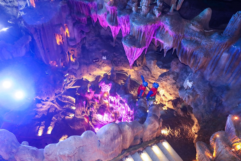 9月29日,国网达州供电公司员工在巴山大峡谷大象洞景区检查洞内灯具和5D投影设备情况。(向姝熹 摄)