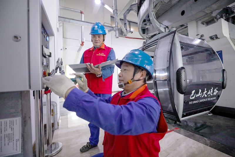 9月29日,国网达州供电公司员工在巴山大峡谷义务维修缆车控制箱。(向姝熹 摄)