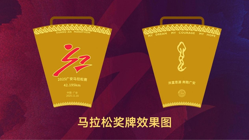 发布会上,主办方还发布了2025广安马拉松奖牌、参赛服等信息。2025广安马拉松奖牌延续了历年生肖奖牌设计,奖牌正面为广安马拉松赛事Logo,背面为蛇年甲骨文设计及赛事主题,连续完成12年广安马拉松赛,集齐12枚完赛奖牌,即可拼合为广安市思源广场形状的终极奖牌。参赛服沿用红色为主色调,并首次采用背心设计,服装正面为“共富思源 奔跑广安”赛事主题,左上方胸口处为赛事Logo,背面为“戒懒”字样。