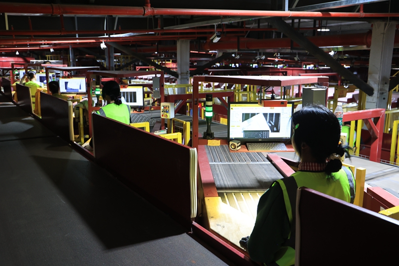 晚上7点,转运中心运输车辆往来不绝。巨大的仓库内,自动分拣设备规律运转,工人们在自己的岗位上紧张有序地工作着。虽然已是晚上,但现场的工作节奏丝毫没有放缓,处处都是争分夺秒的奋战氛围。