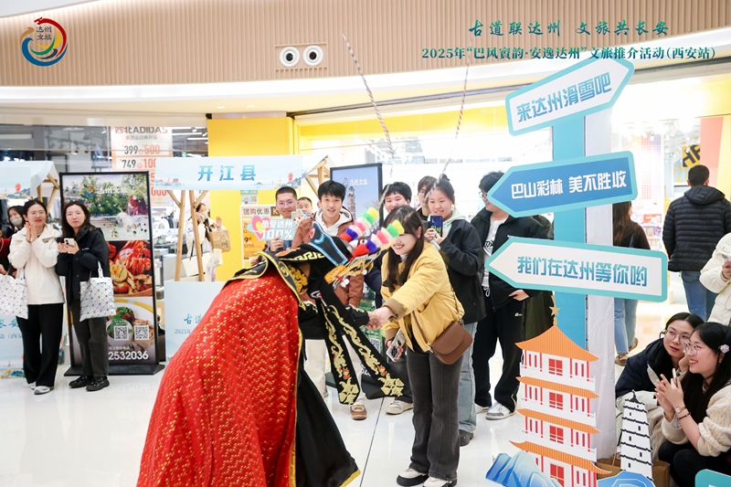 活动中,达州文旅快闪馆通过“三感体验”引发关注,川剧变脸、古典舞蹈等快闪节目吸引众多西安市民游客驻足观看,现场还展示展销了非遗美食灯影牛肉、七星椒、唐鸭子、旧院黑鸡、三汇醋、大竹芝麻薄脆等,可品尝品鉴、咨询选购。同时,现场还设置“互动抽奖”“盲猜大挑战”游戏,游客扫码即可获取达州文旅盲盒,内含景区门票、文创产品等。此外,通川区、万源市、大竹县、渠县文旅部门及巴山大峡谷、月亮坪等重点景区还推介了本地文旅资源及优惠政策。