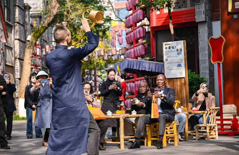 除了体验蜀绣非遗技艺,在百艺堂茶馆前,长嘴壶茶艺师行云流水的民俗表演,更以灵动的技艺展现了巴蜀茶文化的烟火气。