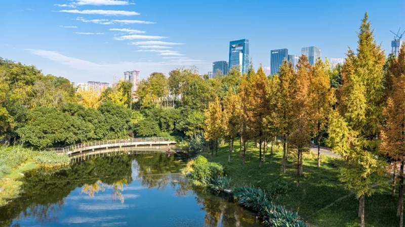 除了兴隆湖,遍布天府新区的生态惠民场景让绿色空间触手可及。天府中央商务区城市森林碳汇综合提升项目位于天府中央商务区片区北侧,西接天府公园,东接鹿溪河生态区,与南侧望山廊平行。项目遵循绿色低碳设计理念,融合了绿色建筑、海绵城市、植物碳汇、本土材料等多专业低碳技术措施,以实现绿色节能、降碳增效及生态价值转换等综合效益。