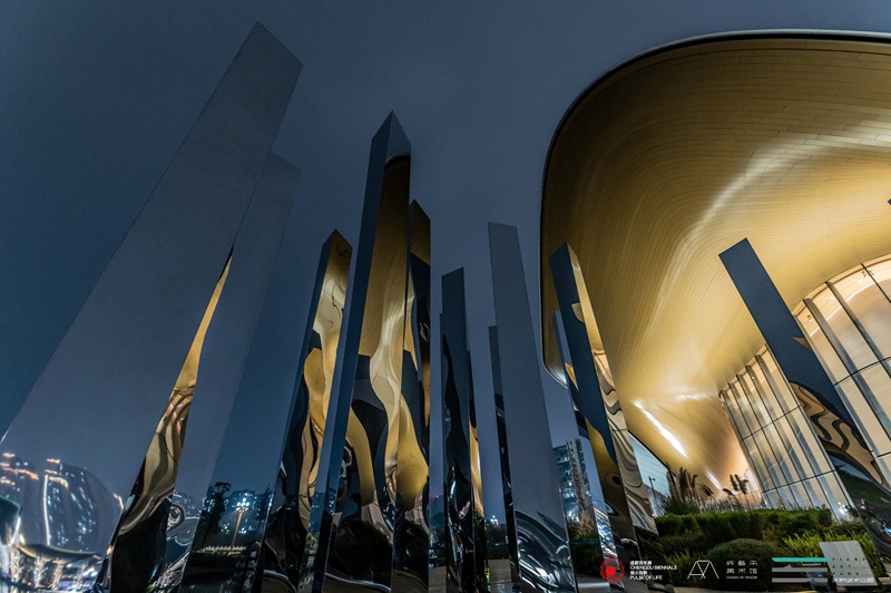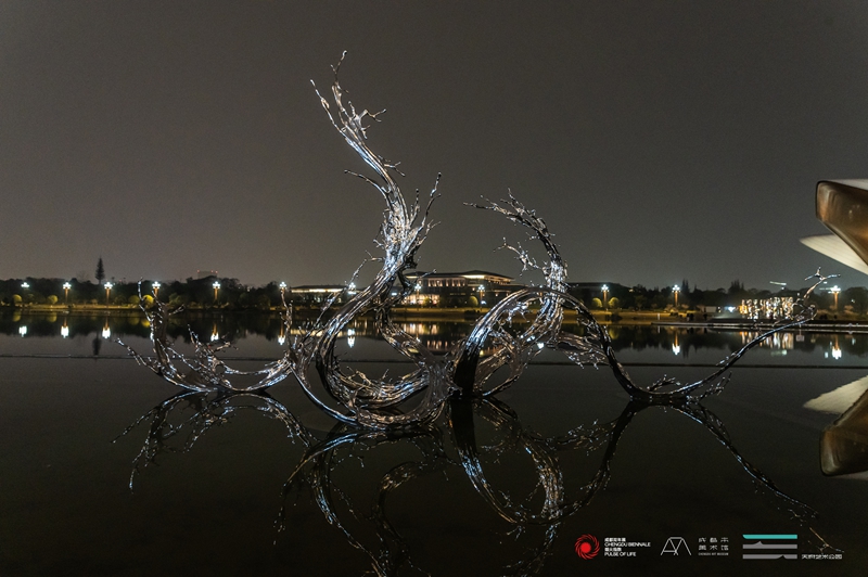 贝纳·维内《无序的弧》矗立三环路主入口,4.1米考顿钢弧线构筑艺术门户;陈粉丸为成都量身打造《太阳鸟》剪纸作品,让古蜀精神图腾绽放在墙面;邓乐《一路风景》亮相A馆湖畔,镜面柱体折射出不断变换的日常瞬间;黄蔚欣《月茧》分别置于湖畔两馆,以向内发光的方式模仿了自我省思的内心世界。