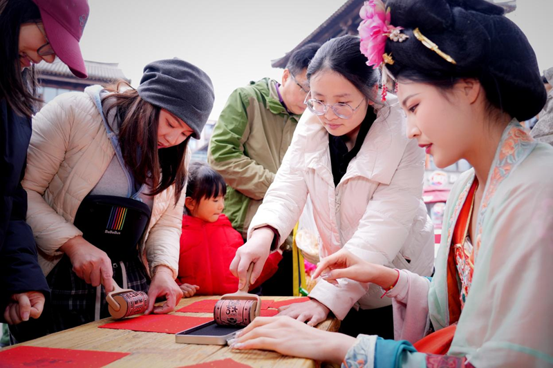 活动现场还设置了拓印制作教学,不少游客参与其中,感受传统技艺的温度;街区内汉服妆造馆、新中式茶饮店、文创商铺等商家同步联动,推出特色主题服务——妆造馆打造专属节日造型,茶饮店限定国风套餐,文创店上新汉服周边好物,全方位满足游客多元需求;同时推出的“汉服+”消费激励措施备受关注,游客在活动期间可享街区内多家餐饮、零售商家折扣,进一步激活古街消费活力。