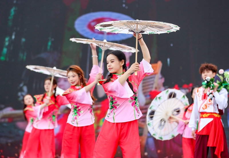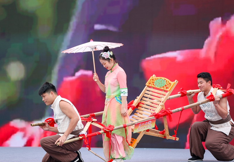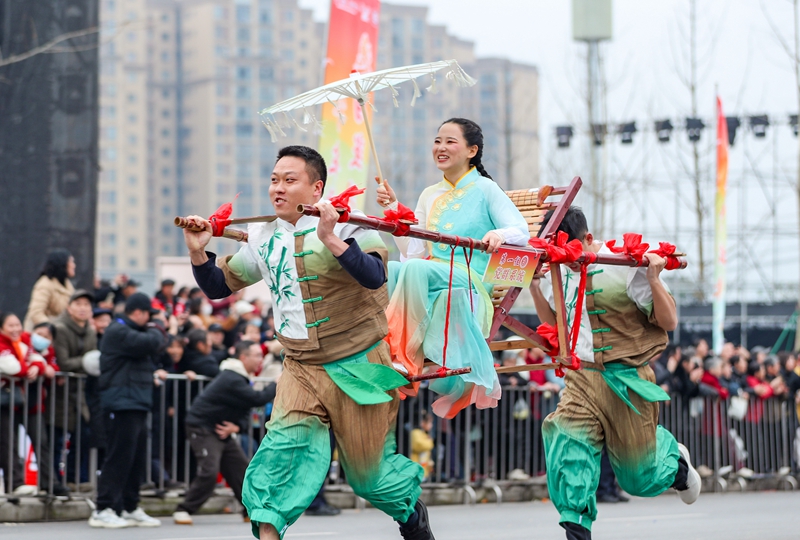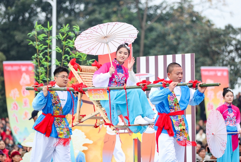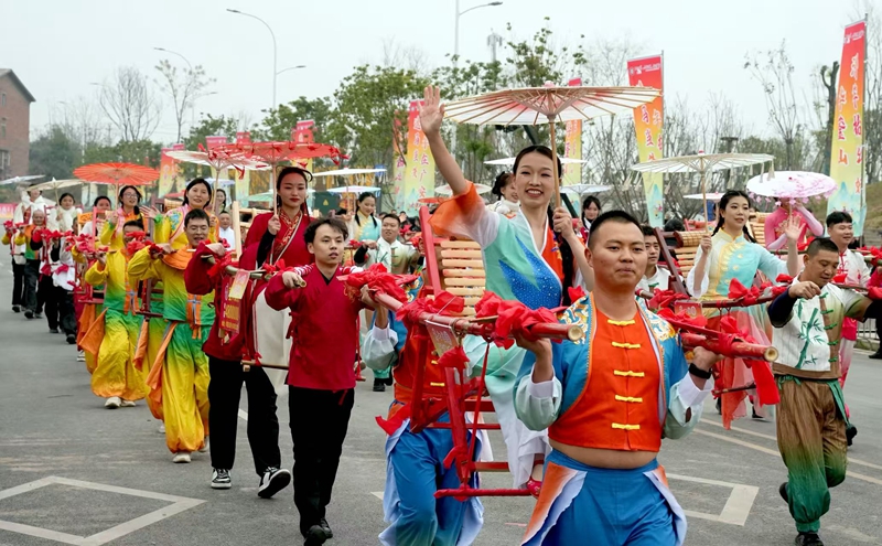 “华蓥山滑竿抬幺妹”起源于唐宋时期华蓥山庙会祈福习俗,以斑竹为架、凉椅为座,融合竞速、表演等元素。下午5时,滑竿巡游将活动推向高潮。参赛队伍组成方阵,沿广场及周边道路行进,“幺妹”与抬夫们与市民游客近距离互动,让非遗真正走进群众生活。