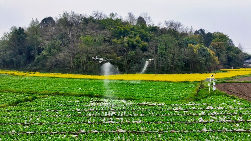 当前,北川8万余亩油菜进入盛花期,成为羌乡春日里一道靓丽风景。在永安镇后庄村,金黄的花海之上,农业社会化服务公司的无人机飞手正操控设备,为油菜喷洒菌核病防治药剂,嗡嗡的螺旋桨声奏响春耕序曲。