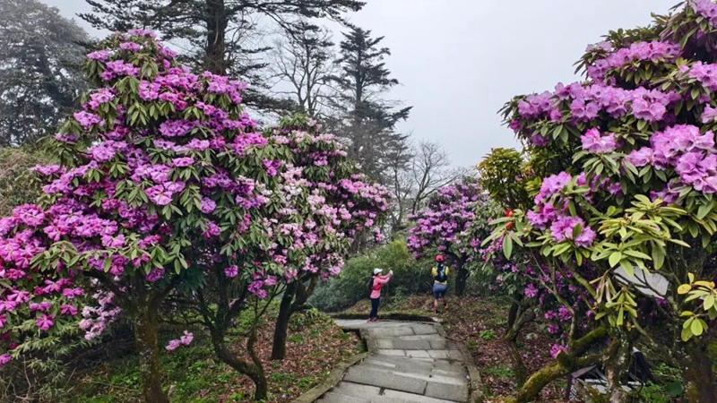 近日,四川峨眉山初殿、华严顶、仙峰寺一带,粉紫高山杜鹃进入盛花期,大钟杜鹃缀满枝头,簇拥古寺禅院,吸引无数徒步游客慕名前往。