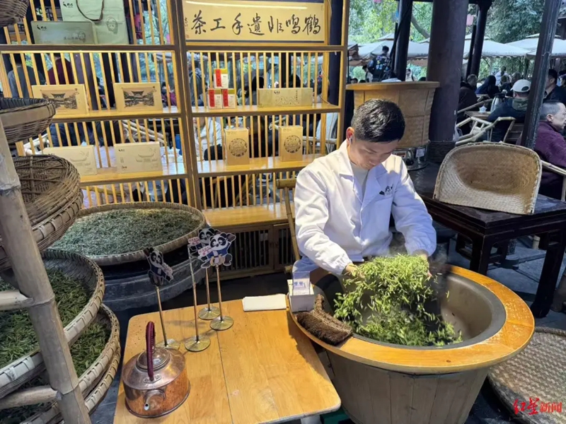 “今天是我们现场炒制的第一天,一位来自北京的游客,观看后当场下单了当天‘头锅’炒制的社前茶,并预约了后续更高海拔的春茶。”苏小峻向记者表示,这种体验不仅吸引国内游客,也成了对外文化展示的窗口。采访间隙,不断有外国面孔的游客好奇地询问炒茶过程,或购买现场制成的茶叶。“如今鹤鸣茶社每日接待的外国游客能达到上百人,占比约十分之一。他们对中国的传统技艺非常感兴趣,无论是长嘴壶茶艺表演,还是手工制茶,都愿意驻足观看、拍照,甚至亲自尝试。”苏小峻说。