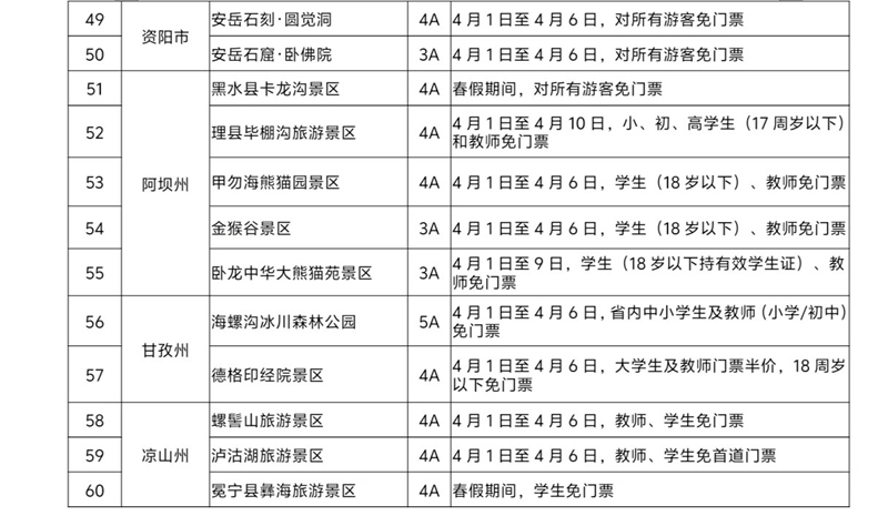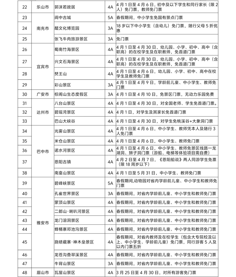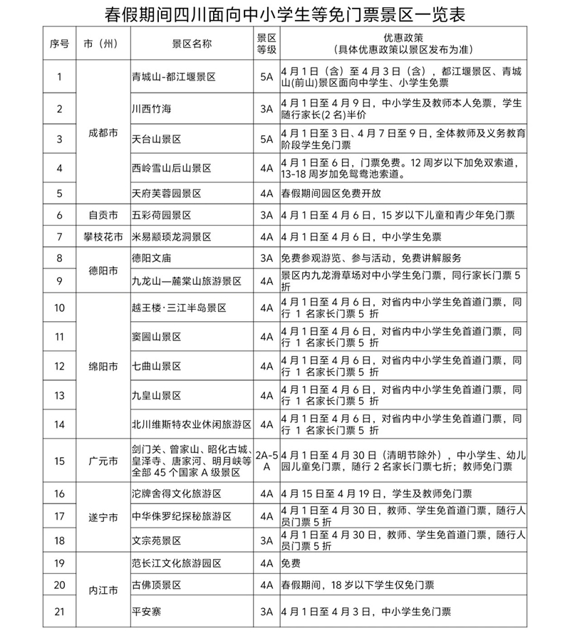 全省100余家A级旅游景区面向中小学生等群体推出免票政策。其中,广元全市45家A级景区于4月1日至4月30日(清明节假期除外)面向全国全日制中小学生、幼儿园儿童、在职教师免门票,每名学生(儿童)随行的2名家长(或法定监护人)也可享受门票7折优惠;青城山-都江堰、海螺沟冰川森林公园等景区针对中小学生等特定群体实施免门票政策;瓦屋山景区、安岳石刻·圆觉洞、天府芙蓉园、黑水县卡龙沟等景区面向所有游客免门票。除100多家景区免门票以外,达古冰川、丹景台等部分景区也推出不同的门票优惠政策。